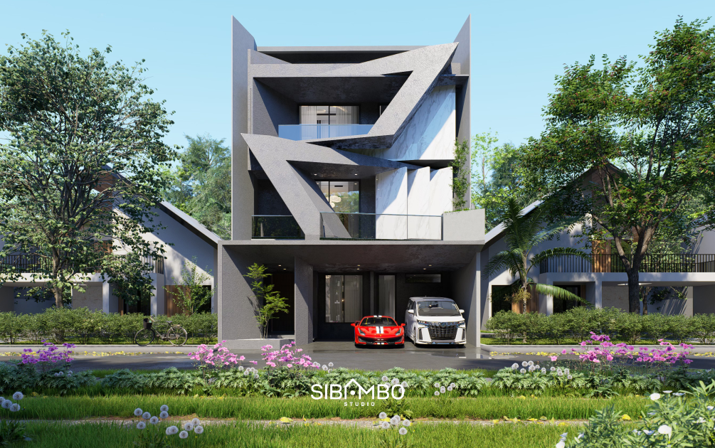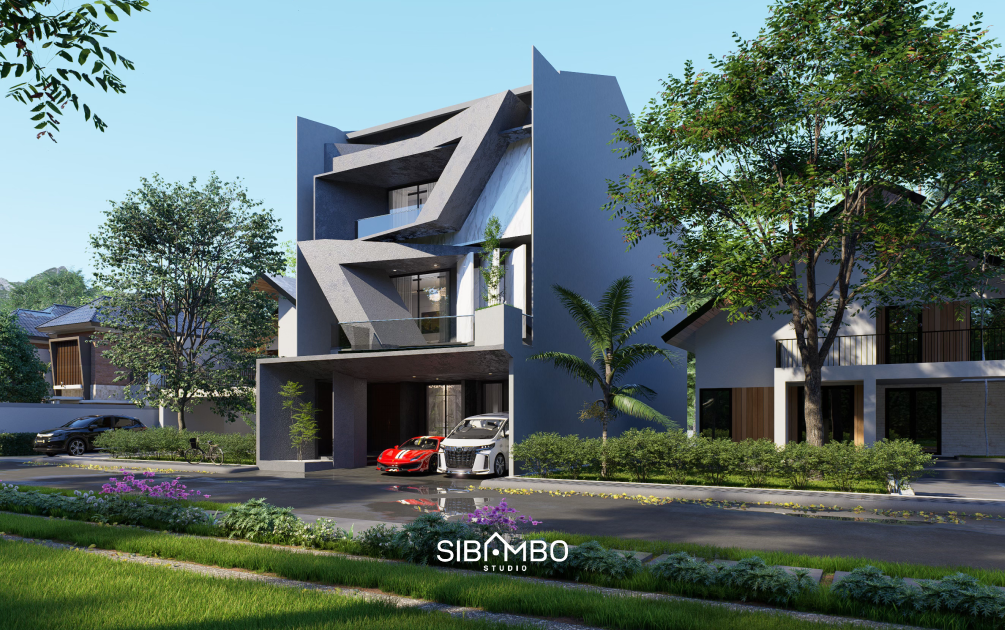 Lucentra House hadir dengan wajah modern futuristik yang kuat. Permainan lekuk geometris pada fasad menjadi elemen visual paling dominan, menghubungkan lantai dua dan tiga dalam satu tarikan bentuk yang dinamis.