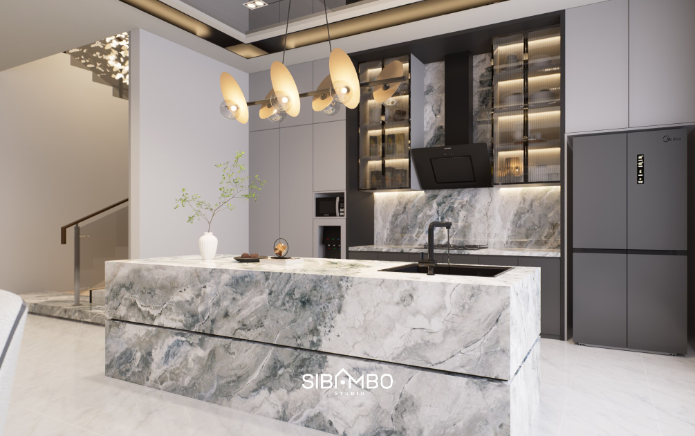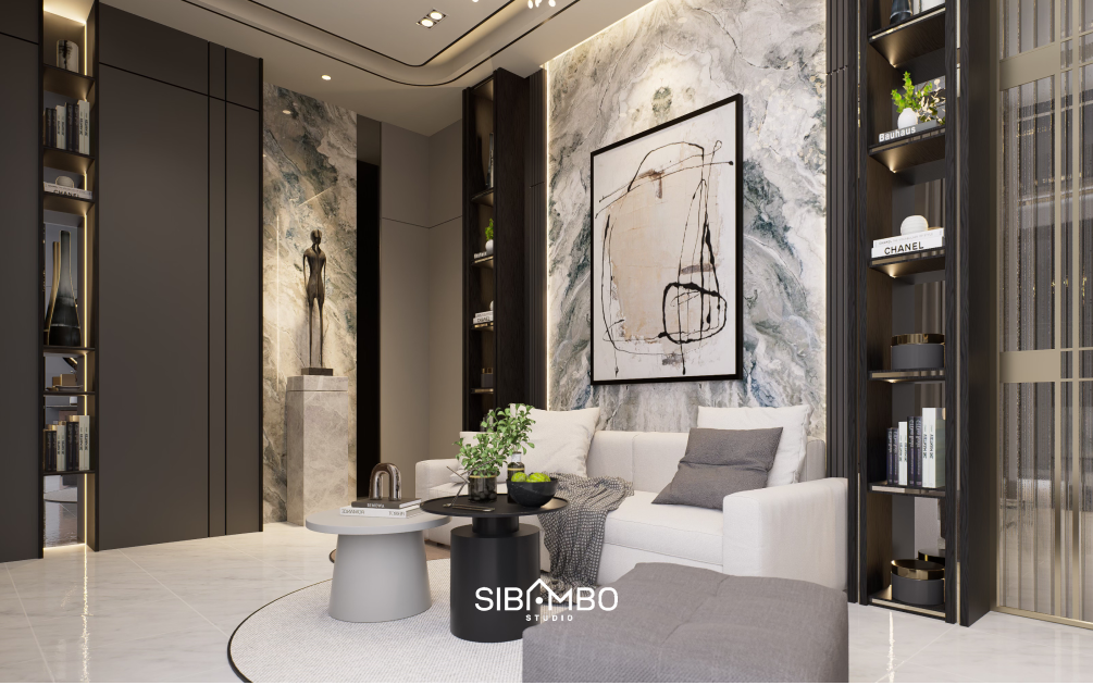 Material premium seperti lantai granit, permainan plywood, dan ornamen dekoratif pada dinding menghadirkan atmosfer elegan sejak langkah pertama. Konsep open plan memperluas pandangan, menciptakan visual yang lega, dan memungkinkan cahaya alami membanjiri seluruh ruang.