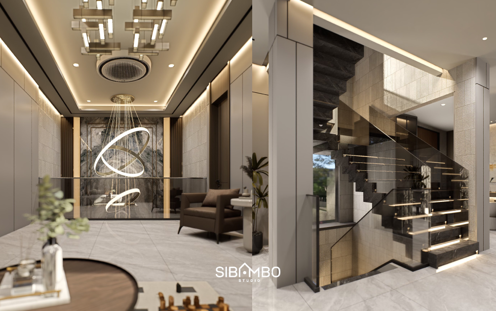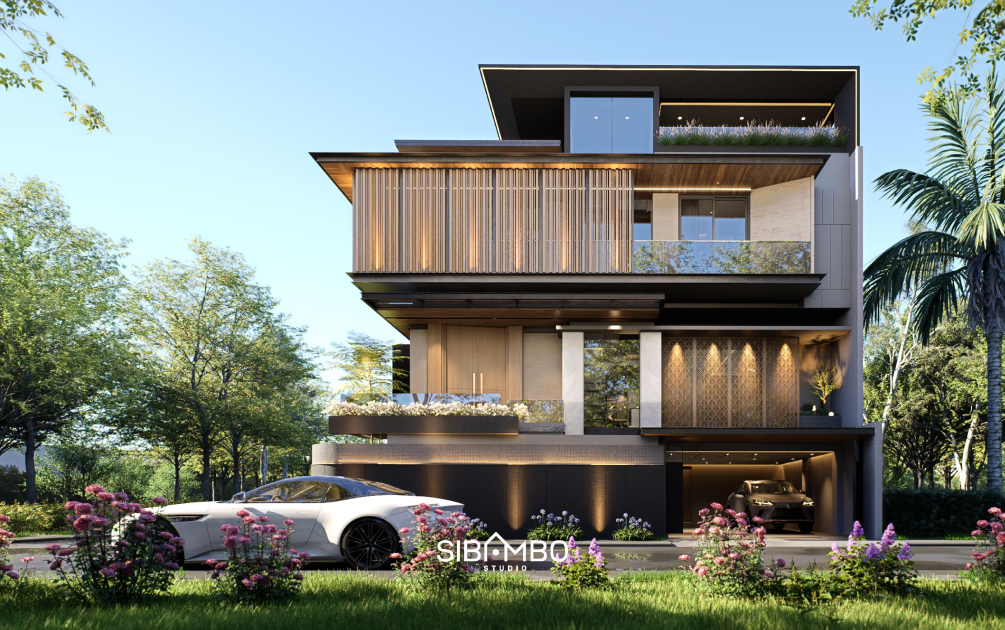 Selain aspek filosofis, konsep utama rumah mengedepankan prinsip modern tropis yang sangat relevan dengan iklim dan konteks perkotaan Indonesia. Elemen tropis seperti bukaan besar, permainan layer fasad, dan material bernuansa natural dipadukan dengan garis-garis modern yang tegas. Hasilnya adalah rumah yang terasa kokoh, dewasa, dan elegan, namun tetap lembut dari dalam.